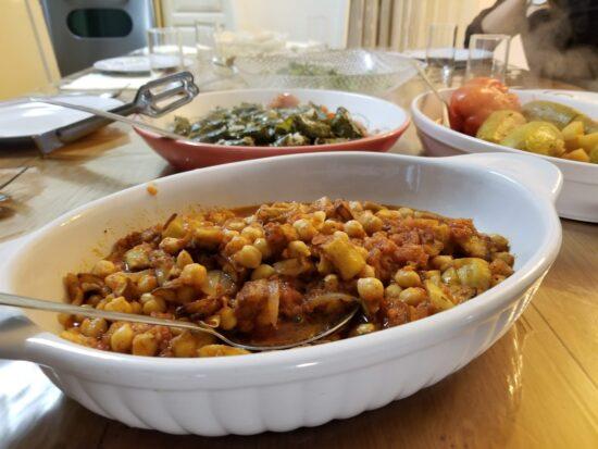 מוסיפים את החצילים המטוגנים לתבשיל, יחד עם החומוס ומערבבים בעדינות כדי שהחצילים המטוגנים לא ימעכו. מוסיפים את התבלינים ומתקנים טעם עם מלח ופלפל ומבשלים עוד 5 דקות.