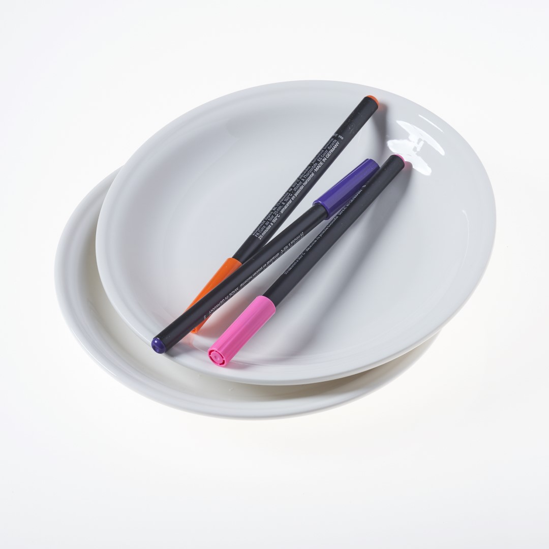 ערכת ציור על פורצלן: 2 צלחות פורצלן לבנות, 3 טושים צבעוניים לפורצלן. כולל דף הסברים