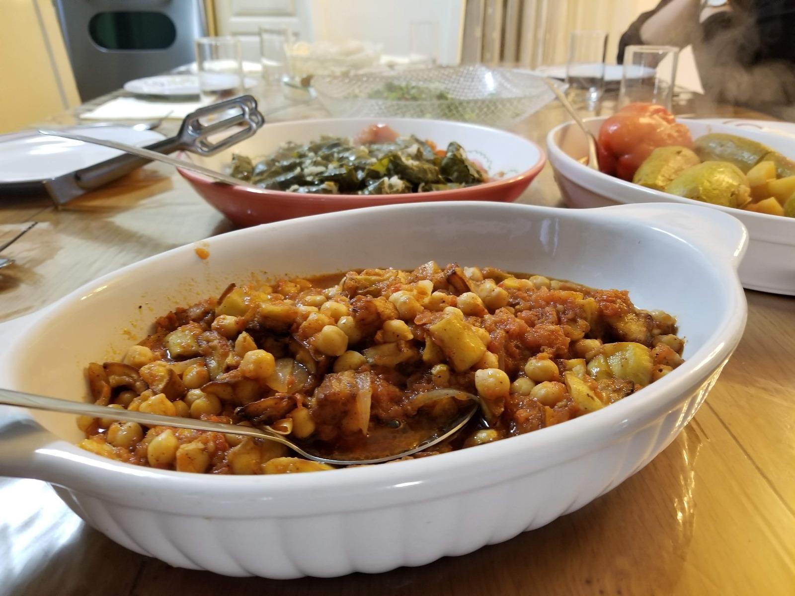 - Add the fried eggplants to the stew, along with the chickpeas and mix gently so that the fried eggplants do not get crushed. Add the spices and adjust the taste with salt and pepper and cook for another 5 minutes.