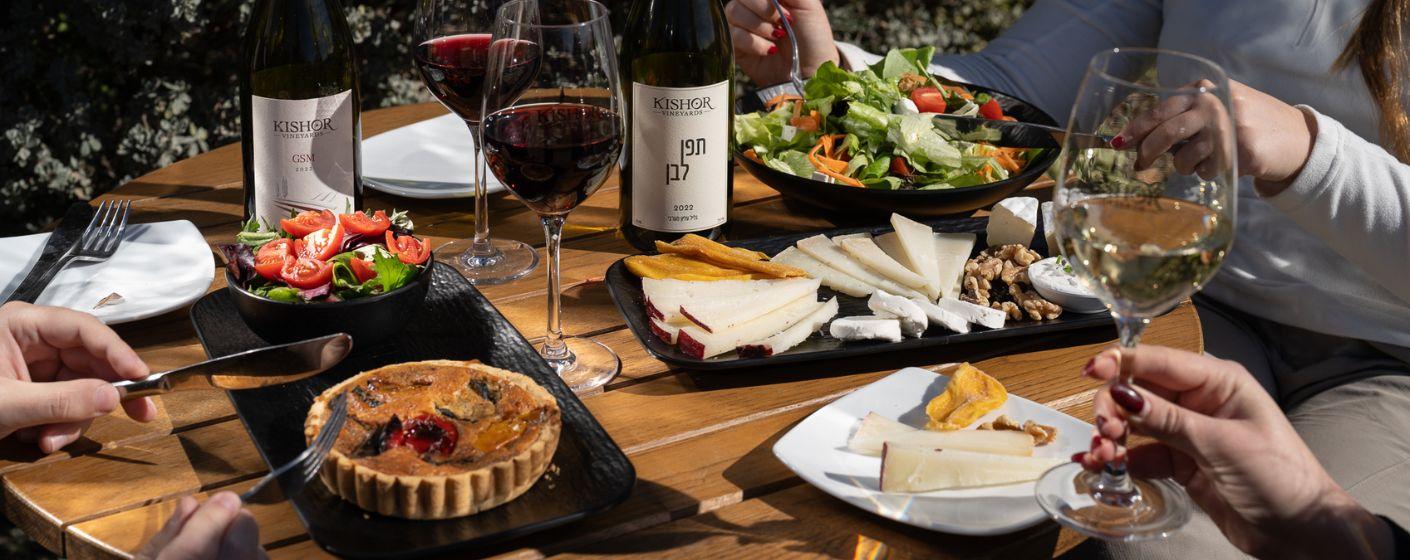 At the beautiful Yodfat Cafe in the Yodfat village, you can choose from the varied menu that includes a selection of vegetarian options such as pizzas, salads, quiches, and more. There is also the option of vegan or gluten-free dishes as well as excellent Galilean wines.